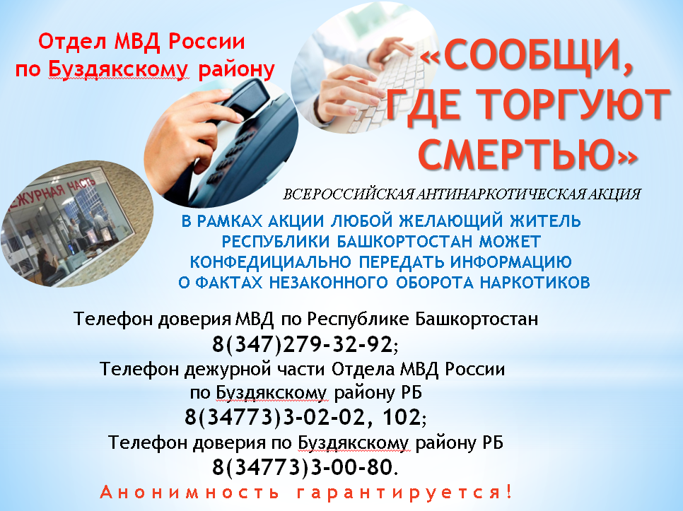 Сообщить информацию связанных с незаконным оборотом наркотиков, реабилитацией наркозавизимых, по «телефонам доверия» МВД по РБ 8(347)279-32-92, в Буздякском районе 8(34773)3-00-80, телефон дежурной части Отдела МВД России по Буздякскому району 8(34773)3-02-02, 102.
